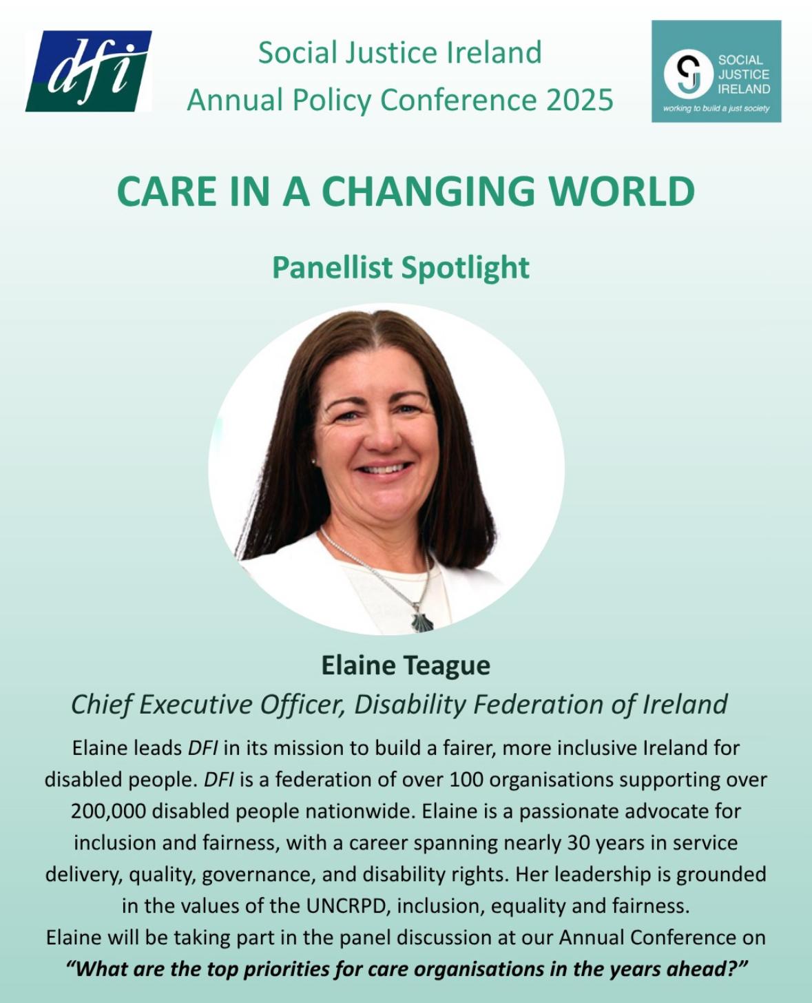At this year’s Social Justice Ireland Annual Social Justice Conference: Care in a Changing World, DFI CEO Elaine Teague highlighted the urgent need to rethink how Ireland approaches care and disability support.